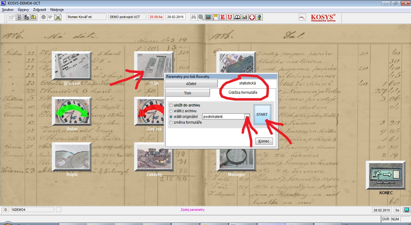 Postup natažení originálního formuláře je obdobný jako u rozvahy. Proveďte natažení originálního a kontrolu na účetní výsledovku. U statistické výsledovky nejsou v UCT účty pro minulý rok, protože jsou uzavřeny pod účtem hospodářeského výsledku. Je třeba ve funkci "Jiný rok" vybrat rok 2013, vytisknout na obrazovku za období minulého roku a v údržbě formuláře statistické výsledovky volbou "Změna formuláře" spustit převod hodnot kliknutím na tlačítko "Minulý rok = běžný rok". Údaje se přesunou do sloupce "minulý rok". Nyní spusťte tisk za aktuální období.